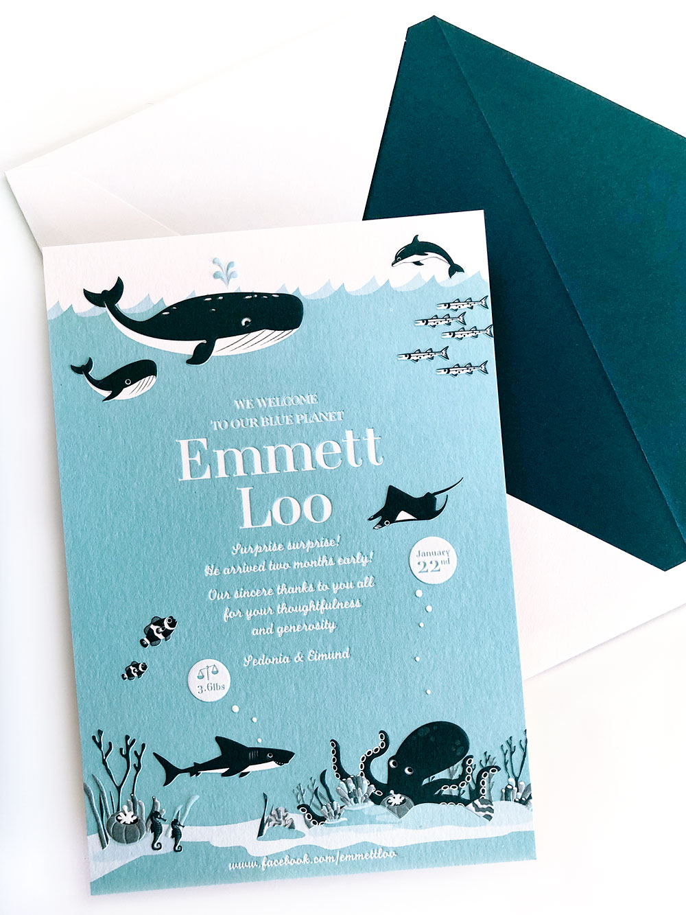 A baby announcement with some aquatic fun! Two parents with a love of scuba diving welcome their son into the fish pond with a embossed, luxurious bespoke print paired with matching envelope liner.